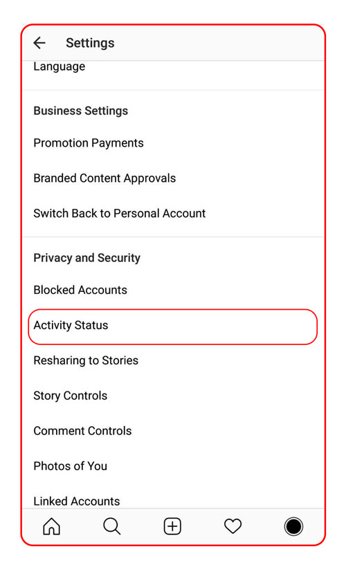 گزینه ای که به نام Activity Status می باشد را در بخش تنظیمات پیدا کرده و آن را لمس کنید تا صفحه ای جلوی شما نمایان شود.