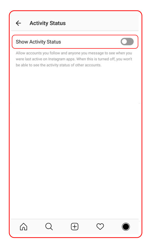 در صورتی که بر روی این گزینه بزنید و آن را غیرفعال کنید، کاربران چه فالوورهای تان و چه سایرین نمی توانند آنلاین بودن شما را متوجه شوند و می توانید با خیالی آسوده مطمئن به مخفی بودن بازدید هایتان در اینستاگرام باشید. تنها نکته ای که در اینجا باید به آن دقت کنید این است که وقتی شما آنلاین بودن خود را مخفی می کنید، اینستاگرام نیز آنلاین بودن افراد دیگر را برای شما پنهان کرده و نشان داده نمی شود، پس شما هم متوجه آنلاین بودن و آخرین بازدید آنها نخواهید شد.
