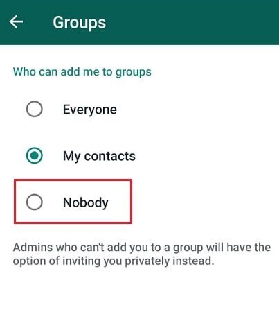 در صورتی که نمی خواهید به هیچ عنوان عضو هیچ گروهی شوید، باید Nobody که گزینه ی سوم در منوی بالاست را انتخاب نمایید و اگر دوست دارید مخاطبان شما بتوانند شما را عضو گروه کنند ولی هیچ کس دیگری نتواند این کار را انجام دهد، باید گزینه ی My Contacts را برگزینید. وقتی از عضو شدن خود در گروه ها جلوگیری می کنید، باید از گزینه ی حریم خصوصی نیز استفاده کرده تا وقتی ادمین گروهی می خواهد شما را به گروهی عضو کند، ابتدا برای شما پیامی ارسال می شود که آیا میل به عضو شدن در این گروه با این نام و این موضوع هستید، و در صورت تایید شما، به گروه عضو می شوید. ولی اگر تمایلی به استفاده از موارد بالا برای عضو شدن اجباری خود ندارید، می توانید به راحتی بعد از عضو شدن در گروهی، آن گروه را ترک کنید.