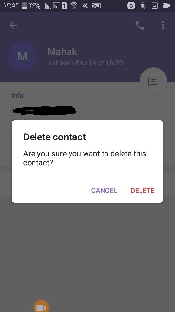 حالا برای شما این پیغام نمایان می شود که می خواهید این مخاطب را حذف کنید و با زدن بر روی Delete ، حذف کردن مخاطب را تایید می کنید.