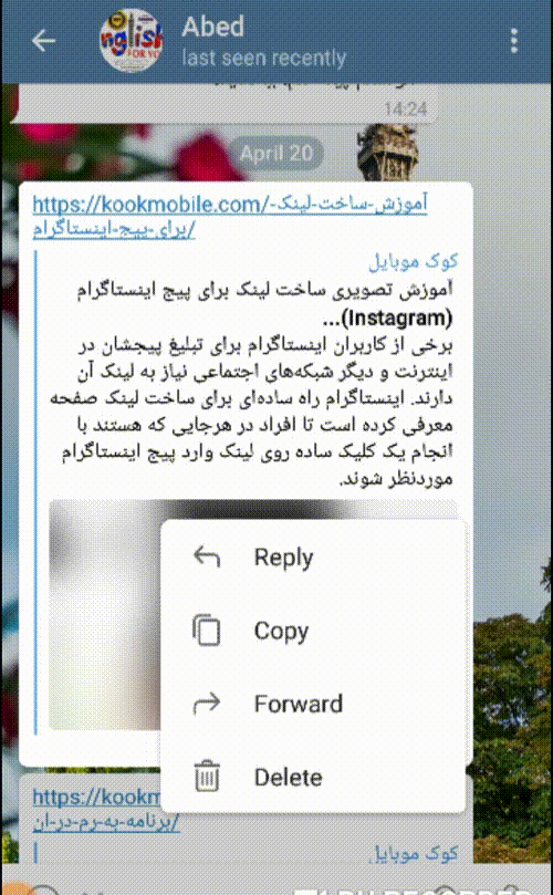 پس گفته شد برای اینکه بتوانید از پیام های مورد پسندتان یک آرشیو تهیه نمایید باید آن ها را در پنجره گفتگوی با اکانت تلگرام خودتان کپی یا فوروارد کنید. در صورتی که می خواهید ضمن آرشیو کردن پیام های برگزیده، اطلاعات فرستنده آن نامشخص باشد باید از آپشن کپی کردن استفاده کنید. ولی در صورتی که کپی شدن مشخصات فرستنده اصلی پیام در آرشیو پیام های برگزیده تلگرام شما برای تان مهم نیست، میتوانید آنها را فوروارد کنید. فرض کنید که در یک گروه تلگرام یا کانالی عضو هستید و حال پیامی را می بینید که مایل به انتقال آن به آرشیو پیام های برگزیده هستید. در صورتی که می خواهید آن پیام بدون اطلاعات فرستنده به پنجره چت با خودتان در تلگرام منتقل گردد، مراحل زیر را انجام دهید: