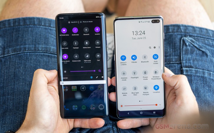 بخش نرم افزار جایی است راه این گلکسی+S10 و OnePlus 7 Pro را در فلسفه آنها، از هم جدا می کند. سامسونگ با در نظر گرفتن اندروید استوک و رابط کاربری و به طور کامل تعمیر آن، ضمن افزودن چندین ویژگی در قسمت بالا، تا قدری مسیر متداول سایر سازندگان قطعات اصلی را در پیش گرفته است. به طور متفاوتی، وان پلاس در طی سالیان متمادی بسیاری از طرفداران سرسخت ویندوز وانیل را از آن خود کرده است.