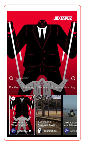 وقتی به صفحه ی IGTV وارد می شوید در ابتدا با یک صفحه ی برفکی را روبرو می شوید، شاید دلیل اینستاگرام برای این کار، این باشد که حس تماشای تلویزیون در ذهن شما تداعی شود. پس از کنار رفتن صفحه ی برفکی، ویدئویی از دوستان خود خواهید دید، همین طور در پایین صفحه نیز در تب های مختلف هم کانال ها و اکانت هایی که ویدئو آپلود کرده اند برای شما قابل مشاهده می باشد.
