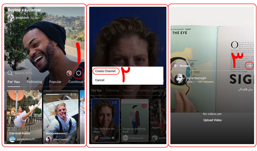 اول از همه، IGTV را لمس کرده و به داخل آن وارد شوید، و روی آیکون تنظیمات یا همان چرخ دنده بزنید، حالا از بین گزینه های قابل رویت، گزینه ی Create Channel را لمس کنید، که کانال شما ساخته و عکس تان در گوشه ی آن نمایان شود. مرحله ی بعدی که باید انجام دهید این است که روی عکس پروفایل خود زده و بر روی علامت + بزنید. به همین سادگی شما می توانید ویدئوی خود را آپلود نمایید.