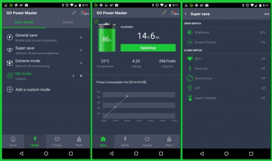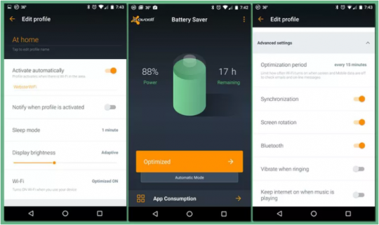 این اپلیکیشن 4 پروفایل آماده برای مصرف باتری دارد. (Home, Work, Night and Super-Saving Emergency mode) که هر کدام از این پروفایل ها تنظیمات آماده ایی برای مصرف باتری گوشی دارند مانند زمانی که شما در خانه هستید و با انتخاب پروفیال Home مصرف باتری گوشی خود را متناسب با فعالیت های روزانه در خانه تنظیم می کنید و در زمانی که شارژ گوشی بسیار کم باشد می توانید در حالت ذخیره فوق العاده ایی گوشی خود را قرار دهید.