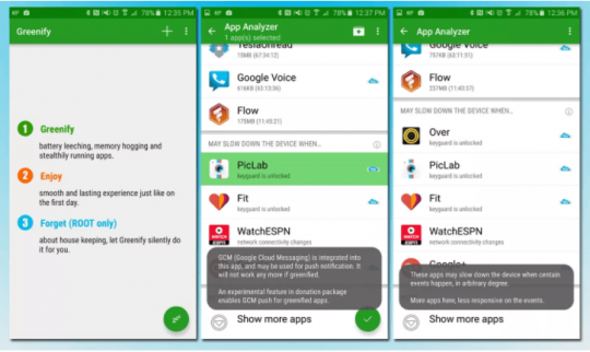 در این اپلیکیشن می توانید برنامه و قابلیت هایی که می خواهید به خواب نروند را انتخاب کنید و یکی از ویژگی های قابل تحسین اپلیکیشن Greenify این است که باعث می شود گوشی شما بلافاصله بعد از آن که کار شما با آن تمام شد به خواب برود. در حالت عادی هنگامی که چند ساعت از گوشی استفاده نمی کنید مانند زمانی که خواب هستید گوشی شما به حالت خواب می رود ولی با اپلیکیشن Greenify استفاده بهینه از باتری گوشی از همان لحظه اول که گوشی را کنار می گذارید شروع می شود.