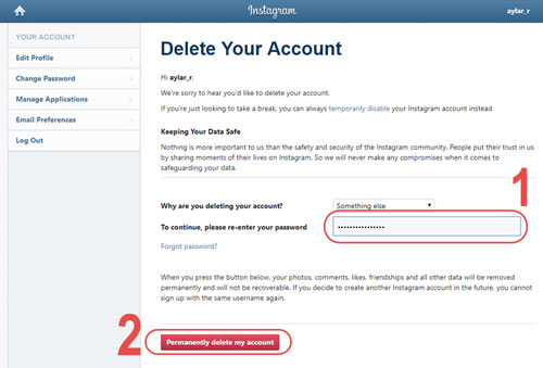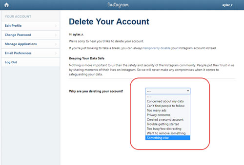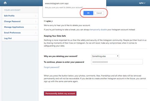 این مرحله، مرحله تکرار این سوال است که آیا از حذف اکانت خود در اینستاگرام اطمینان کافی دارید؟ و اگر تصمیم قطعی خود را برای انجام این کار گرفته باشید، باید تایید کنید تا اکانت خود را برای همیشه از دسترس خارج نمایید و دیگر اکانتی به این نام وجود نخواهد داشت.